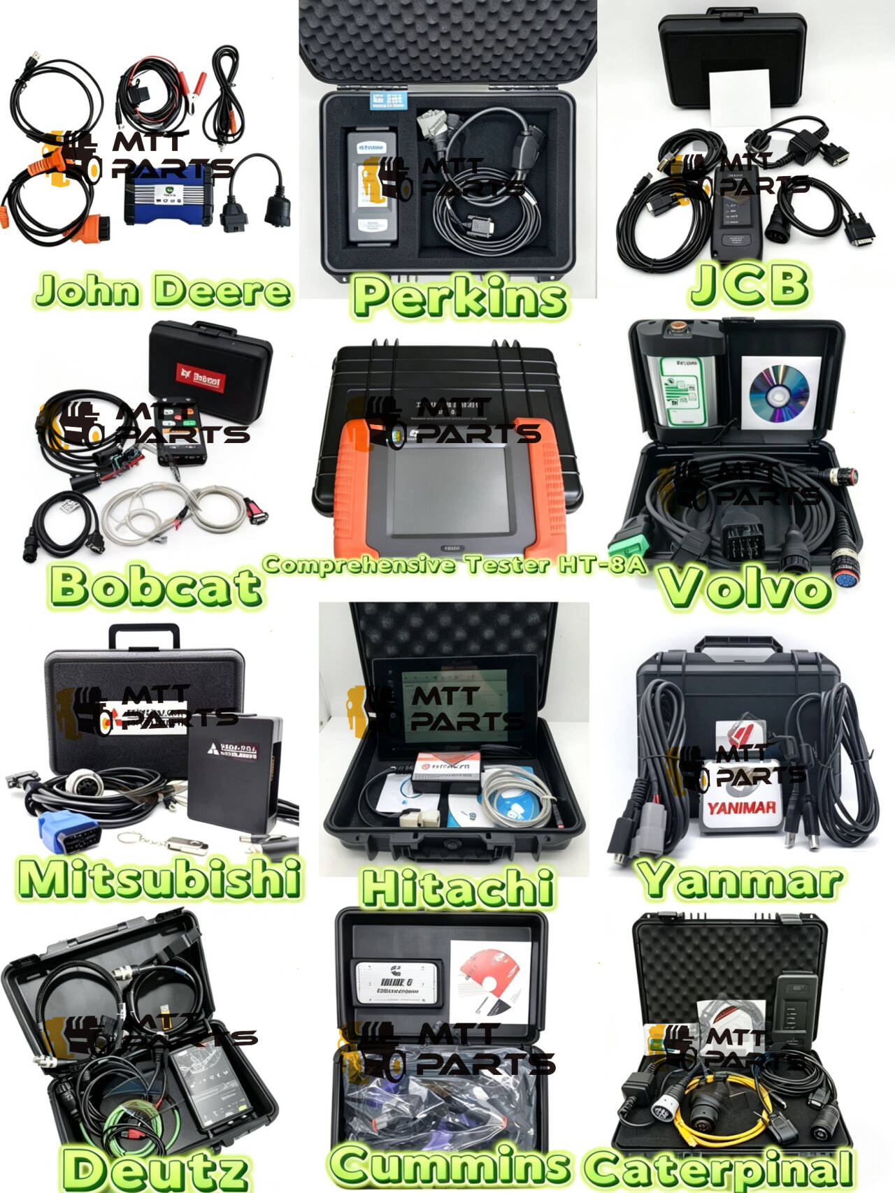 तिनीहरू कत्तिको व्यावहारिक देखिन्छन् भन्ने कुरा बाहिर खडा छ। आधा काम गर्न सक्ने कुनै सामान्य उपकरण छैन; यी ब्रान्ड-विशिष्ट सेटअपहरू हुन् जुन ठीकसँग जडान हुन्छन् र तपाईंलाई वास्तवमा आवश्यक पर्ने डाटा दिन्छ। त्यहाँ बीचमा देखाइएको एक व्यापक सबै-मा-एक परीक्षक (HT-8A) पनि छ, साथै Yanmar वा Bobcat जस्ता राम्रो निदान खोज्न अलि गाह्रो हुने ब्रान्डहरूका लागि विकल्पहरू।